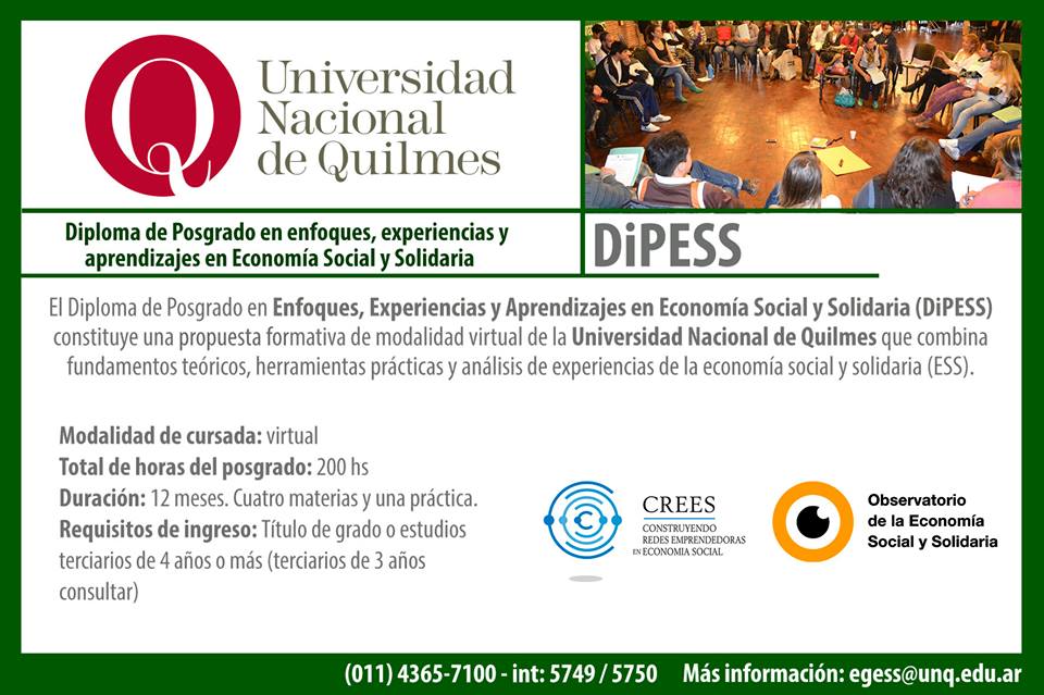 El Diploma de Posgrado en Enfoques, Experiencias y Aprendizajes en Economía Social y Solidaria (DiPESS) constituye una propuesta formativa de modalidad virtual de la Universidad Nacional de Quilmes (UNQ) que combina fundamentos teóricos, herramientas prácticas y análisis de experiencias de la economía social y solidaria (ESS).