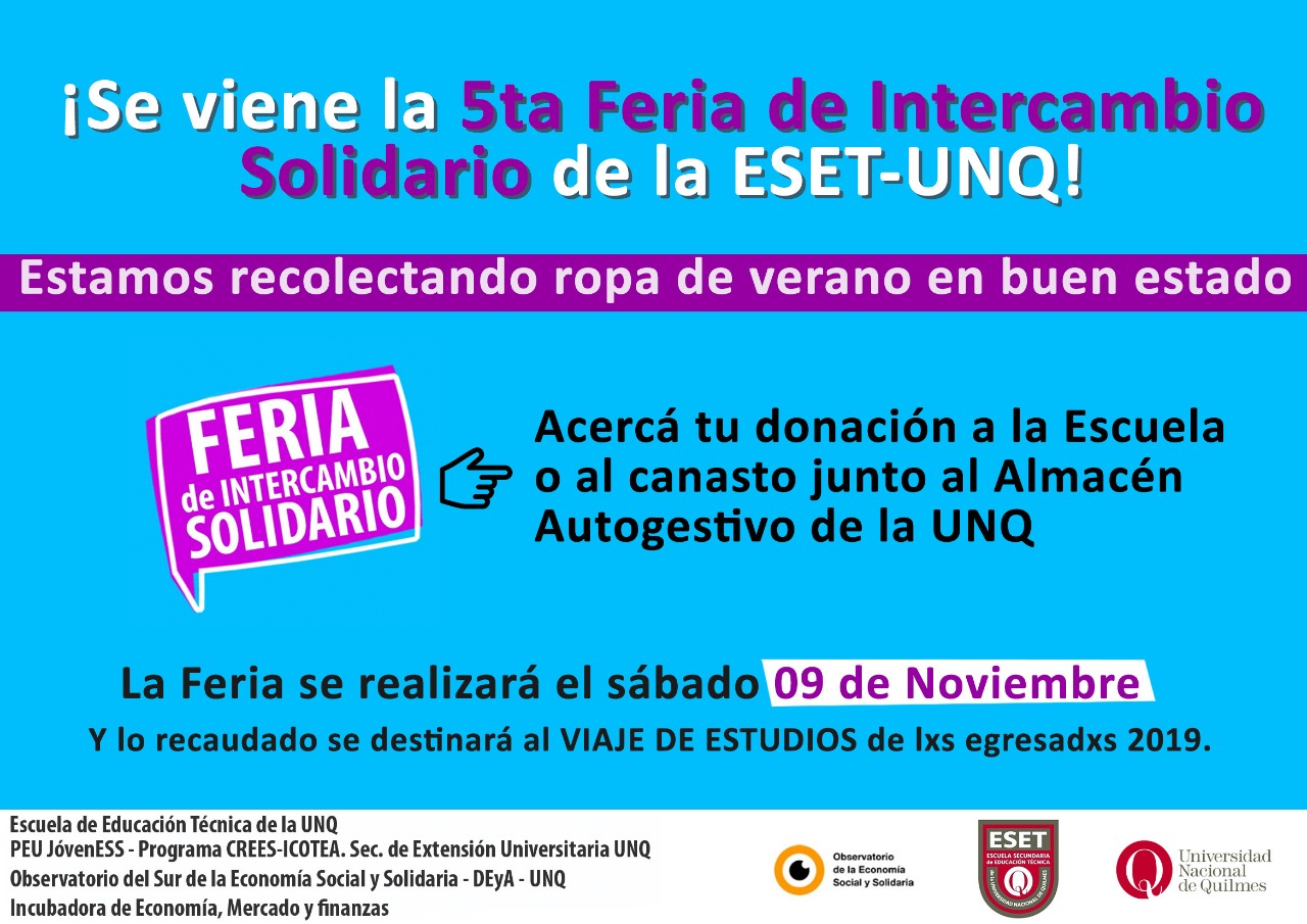 El sábado 9 de noviembre se realizará la Quinta Feria de Intercambio Solidario en la Escuela Secundaria de Enseñanza Técnica de la Universidad Nacional de Quilmes. La Feria es un espacio de aprendizaje en clave de Economía Social y Solidaria.