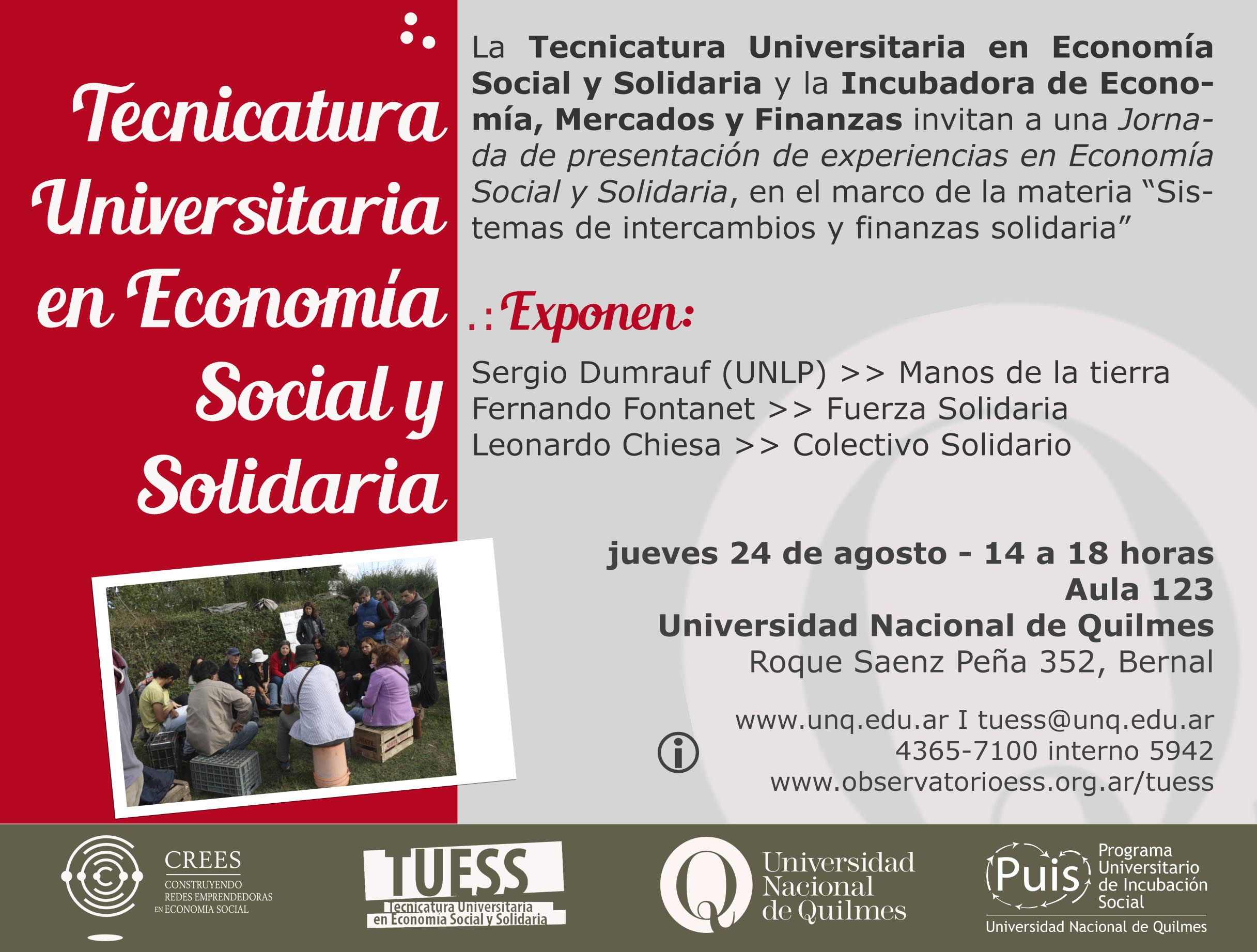 Docentes: Nelly Schmalko, Cristian Silva, Emiliano Recalde, Mahuen Gallo. Integrantes del Proyecto CREES (Construyendo Redes Emprendedoras en Economía Social) de la Universidad Nacional de Quilmes: