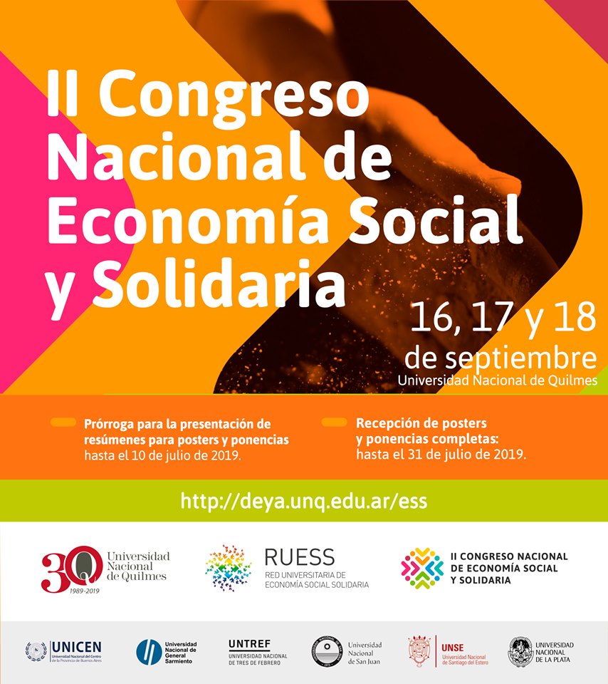 El 16, 17 y 18 de septiembre de 2019 se llevará a cabo el II Congreso Nacional de Economía Social y Solidaria en la Universidad Nacional de Quilmes (UNQ) co-organizado por las Universidades Nacionales del Centro de la Provincia de Buenos Aires, General Sarmiento, San Juan y Tres de Febrero, a las que se sumaron más recientemente las Universidades Nacionales de Santiago del Estero y de La Plata, así como equipos académicos de distintas universidades en el marco de la Red Universitaria de Economía Social y Solidaria (RUESS), que aportan en la co-coordinación de los ejes temáticos del congreso, que se presentan más adelante.