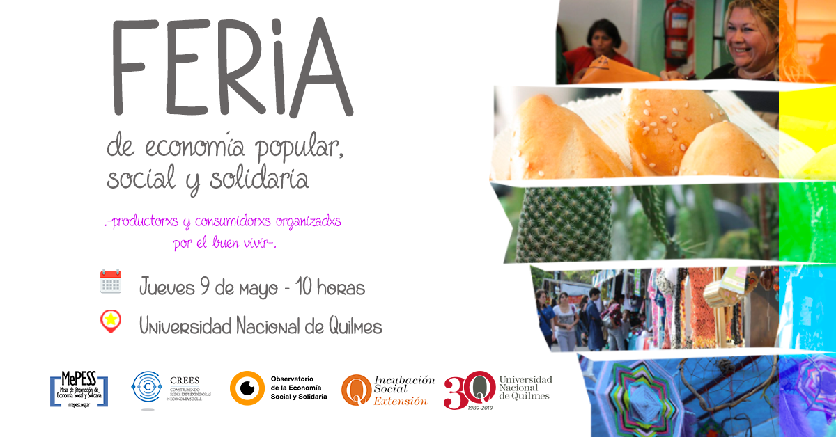 El jueves 9 de mayo de 2019 se realizará una nueva edición de la Feria de Economía Popular, Social y Solidaria en la Universidad Nacional de Quilmes. Como siempre, los y las productores ofrecerán sus productos a la Comunidad Universitaria. Es una iniciativa del Observatorio de la Economía Social y Solidaria CREES junto a la Mesa de Promoción de la Economía Social y Solidaria -MePESS-